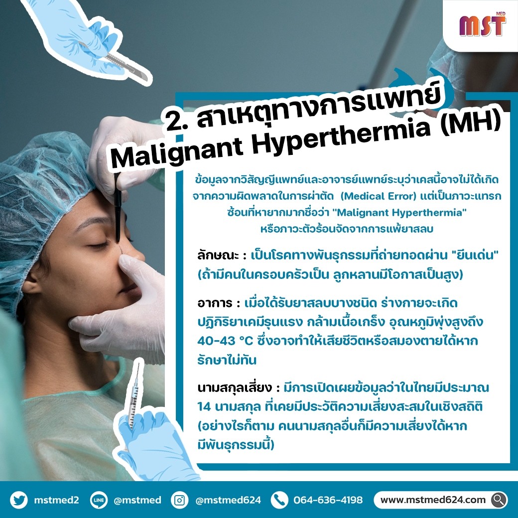 สาเหตุทางการแพทย์ คาดว่าเป็นภาวะ 𝐌𝐚𝐥𝐢𝐠𝐧𝐚𝐧𝐭 𝐇𝐲𝐩𝐞𝐫𝐭𝐡𝐞𝐫𝐦𝐢𝐚 (𝐌𝐇) หรืออาการแพ้ยาสลบขั้นรุนแรงจากพันธุกรรม