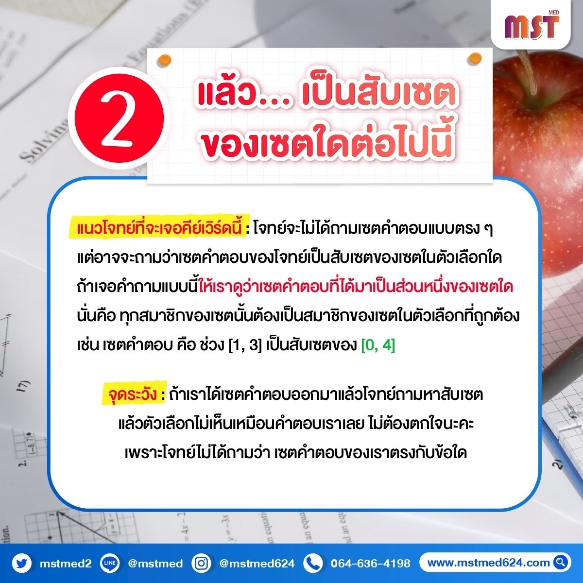 2️⃣ "...เป็นสับเซตของเซตใดต่อไปนี้" 🔍โจทย์แนวนี้ไม่ได้ถามหาคำตอบตรงๆ แต่ถามว่าคำตอบเราไป "ซ่อน" อยู่ในข้อไหน! อย่าตกใจถ้าช้อยส์ไม่เหมือนคำตอบเราเป๊ะๆ แค่เช็กว่ามันครอบคลุมคำตอบเราหรือเปล่าก็พอ! ✅