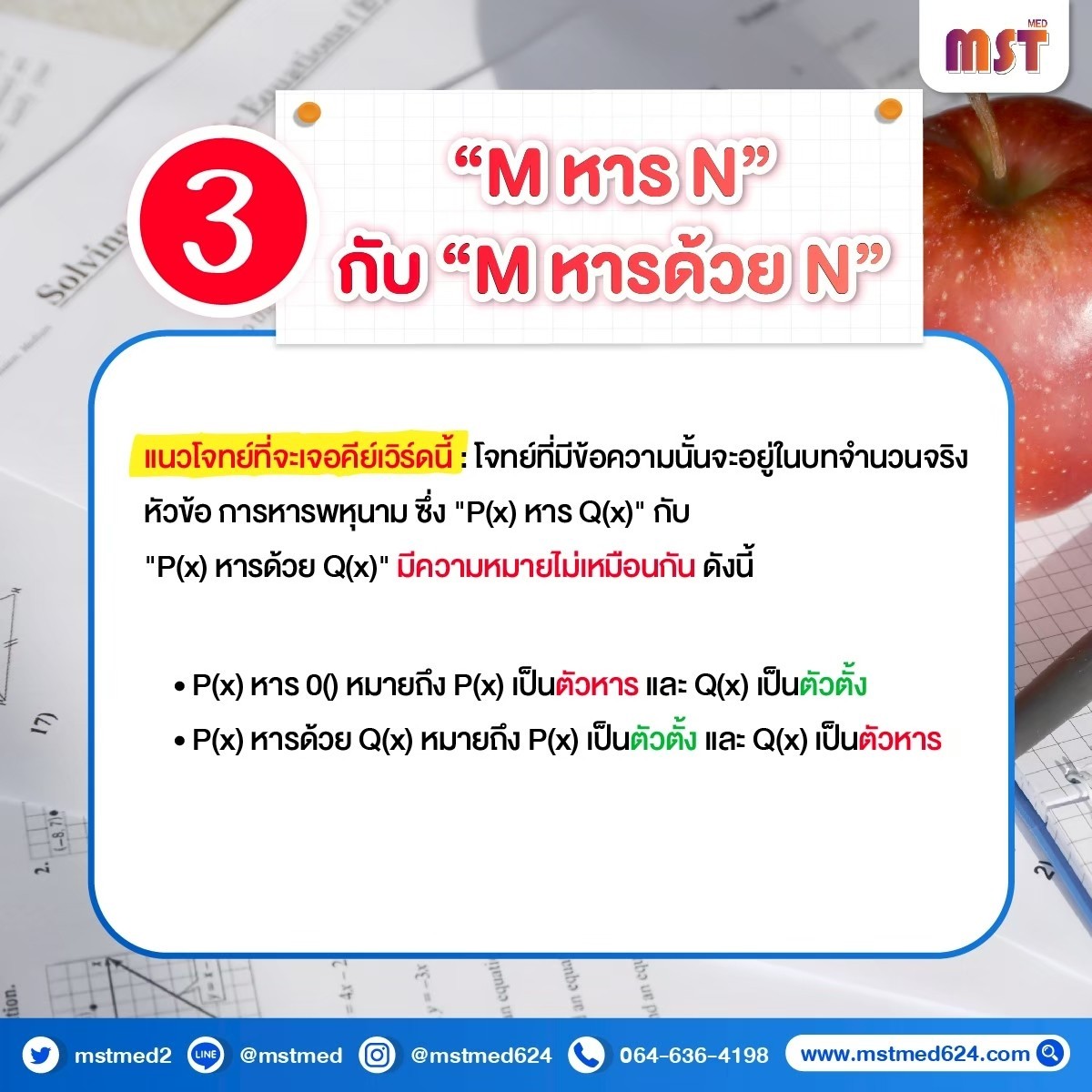 3️⃣ "M หาร N" vs "M หารด้วย N" ➗คำสั้นๆ แต่ความหมายเปลี่ยนชีวิต!🔹 M หาร N : N คือตัวตั้ง (N/M)🔹 M หารด้วย N : M คือตัวตั้ง (M/N)จำสลับกัน = คะแนนหายวับทันที! 🧨