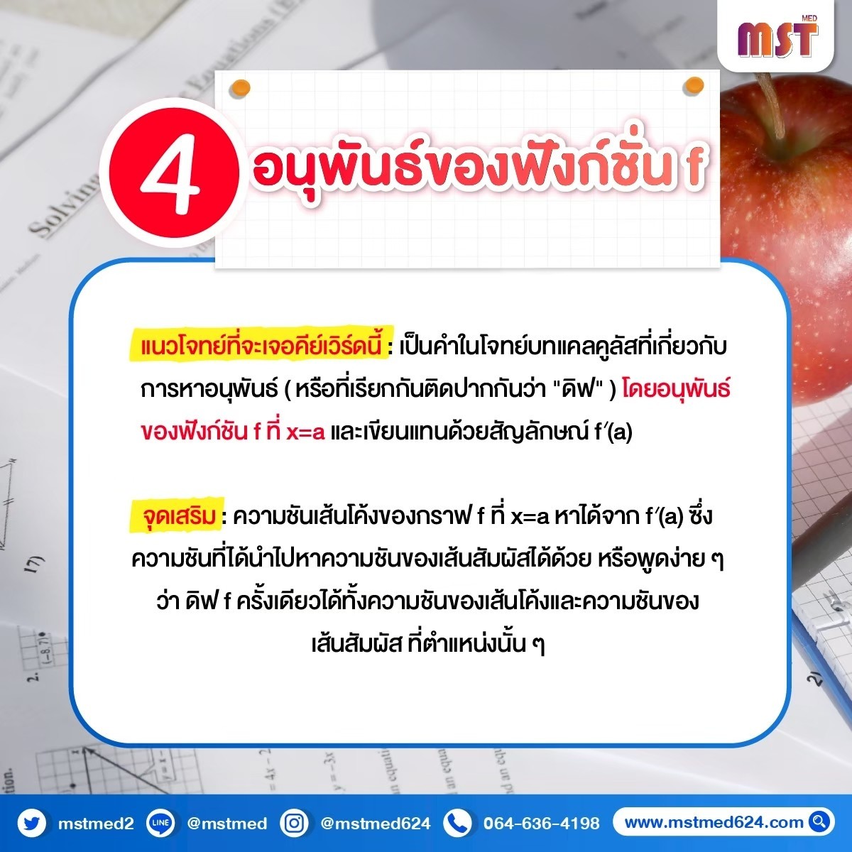 4️⃣ "อนุพันธ์ของฟังก์ชัน f ที่ x=a" 📈หรือที่น้องๆ เรียกกันว่า "ดิฟ" (Diff) นั่นเอง! นอกจากจะใช้หาความชันเส้นโค้งแล้ว ยังใช้หาความชันเส้นสัมผัส ณ จุดนั้นได้ด้วยนะ! ดิฟครั้งเดียวคุ้มสุดๆ! ⚡️