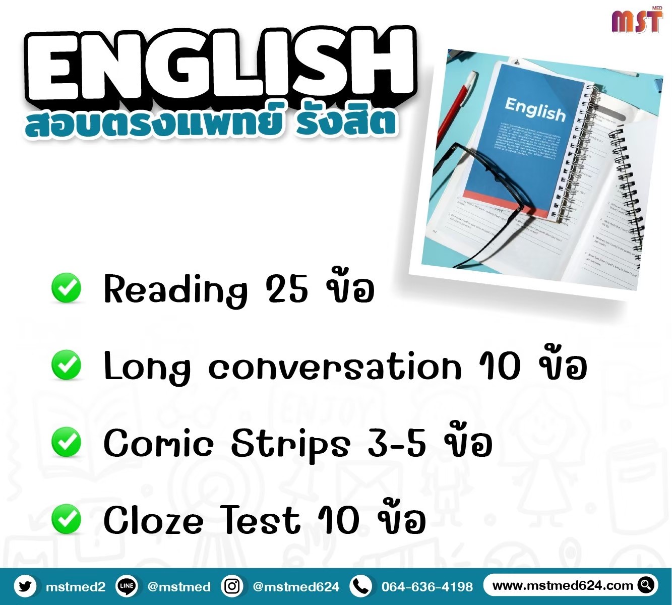 ENGLISH Reading (25 ข้อ), Long conversation (10 ข้อ), Cloze Test (10 ข้อ)