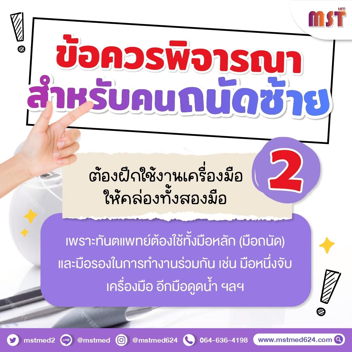 หลายคนอาจกังวลเรื่องเก้าอี้ทำฟันหรืออุปกรณ์ต่างๆ แต่รู้ไหมว่า... ทันตแพทย์ที่เก่งๆ หลายท่านก็ถนัดซ้าย! หัวใจสำคัญอยู่ที่การฝึกฝนกล้ามเนื้อและความชำนาญ ซึ่งเราพร้อมจะเทรนให้น้องๆ แบบจัดเต็ม!