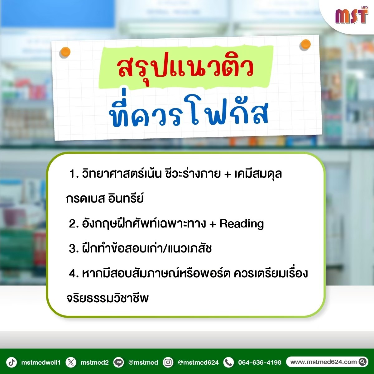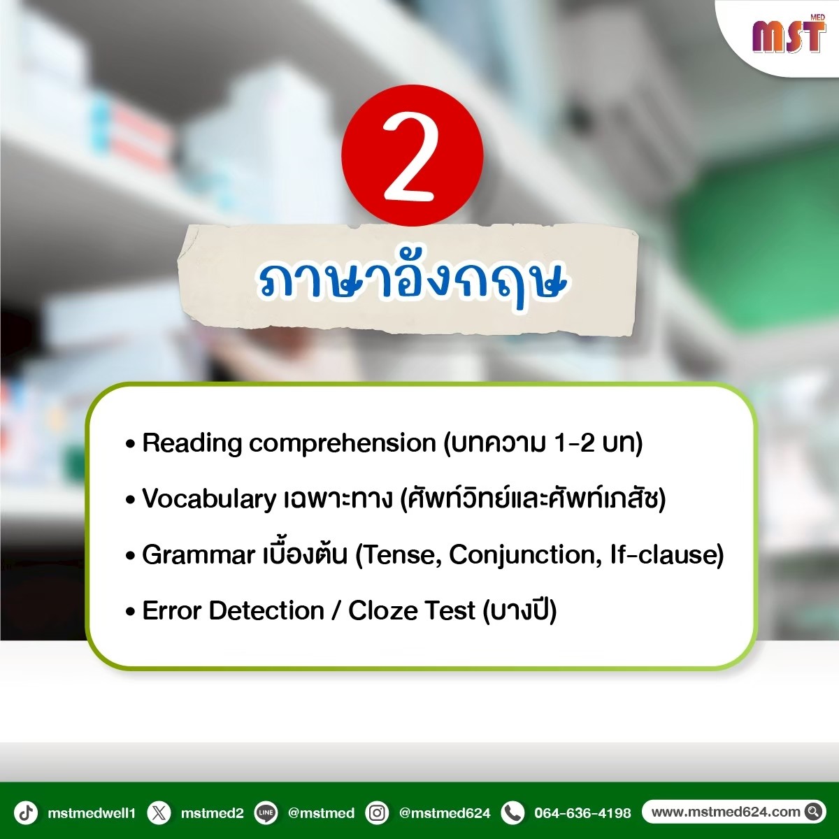 ไม่ใช่แค่ Grammar แต่ต้องฝึก Reading Comprehension และ Vocabulary เฉพาะทาง (ศัพท์วิทยาศาสตร์/ศัพท์เภสัชฯ เช่น drug, tablet, pharmacist) เพื่อให้คุ้นเคยกับบทความทางการแพทย์
