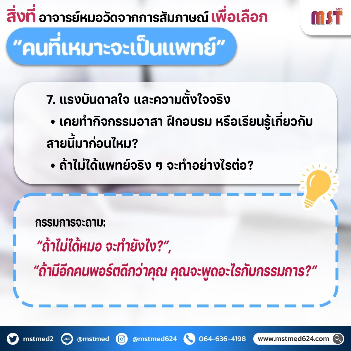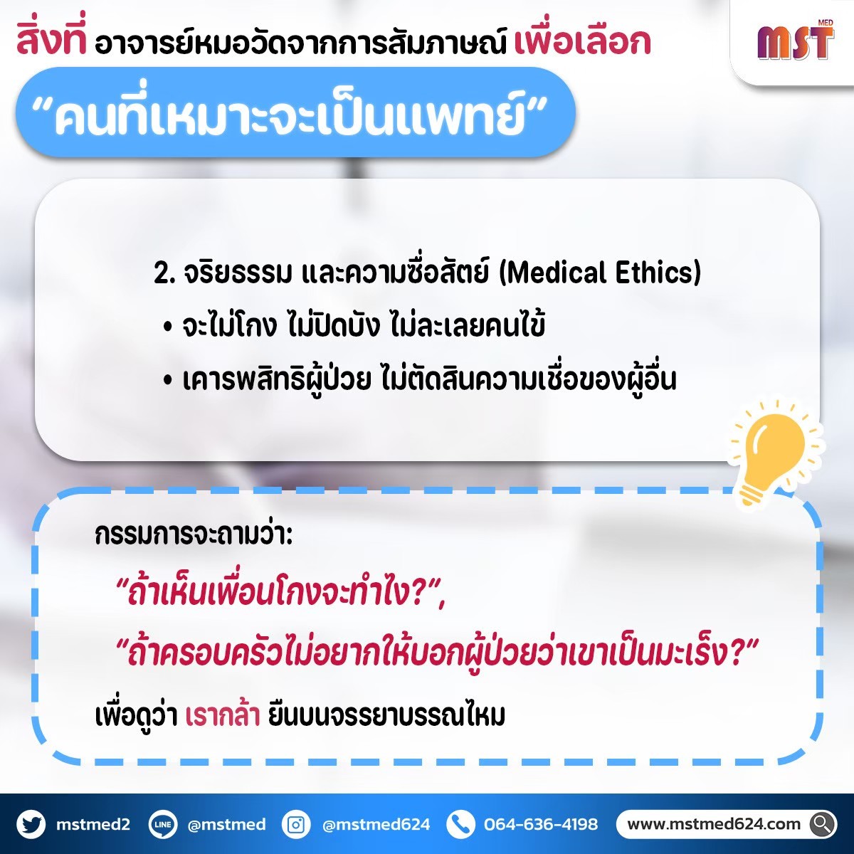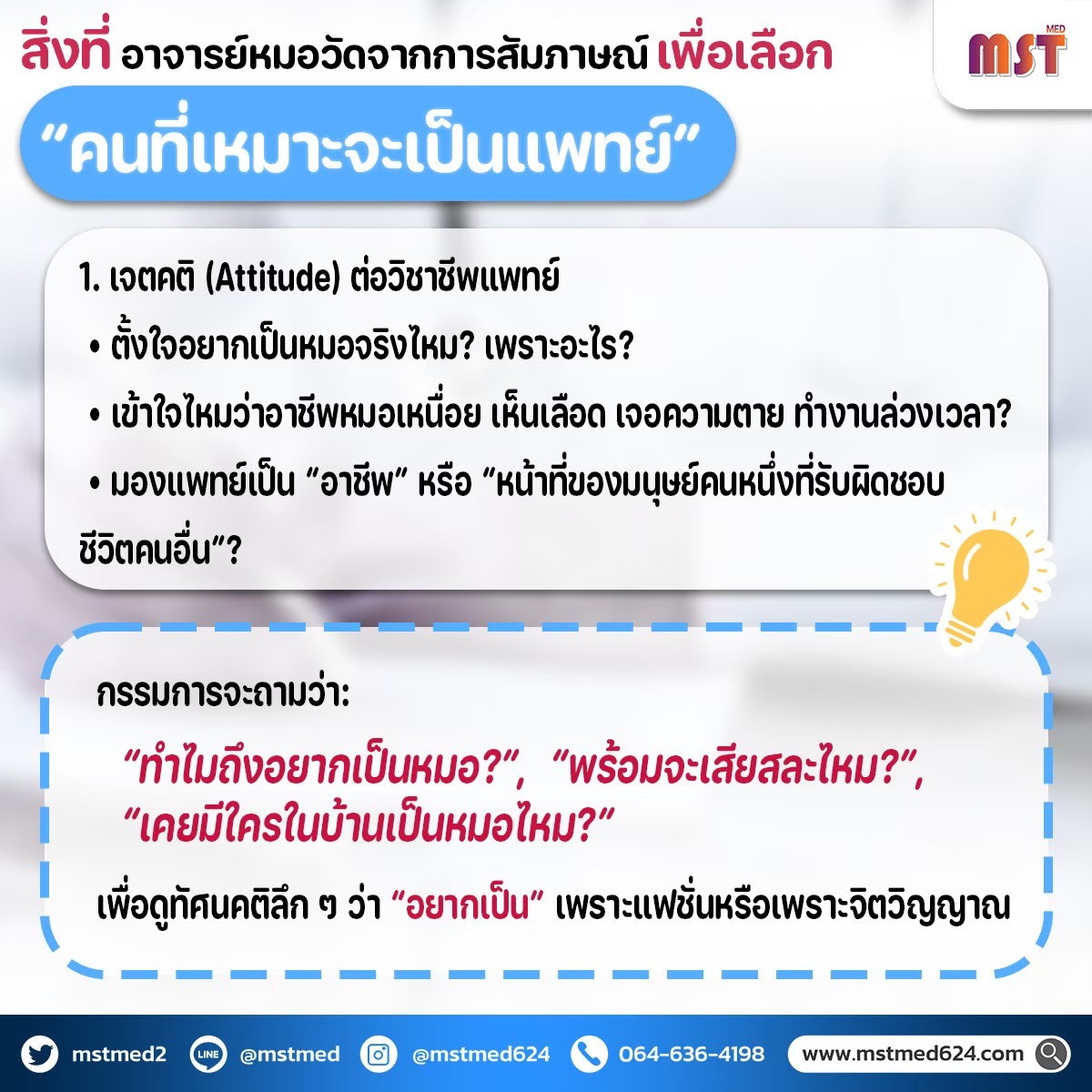 💡 เจตคติ (Attitude) ต่อวิชาชีพแพทย์: กรรมการจะเจาะลึกว่าคุณอยากเป็นหมอเพราะ "แพสชั่น" จริง ๆ หรือไม่? เข้าใจความเหนื่อยล้า ความกดดัน และความรับผิดชอบต่อชีวิตผู้อื่นหรือไม่? (ดูจากคำถาม เช่น "พร้อมเสียสละไหม?")