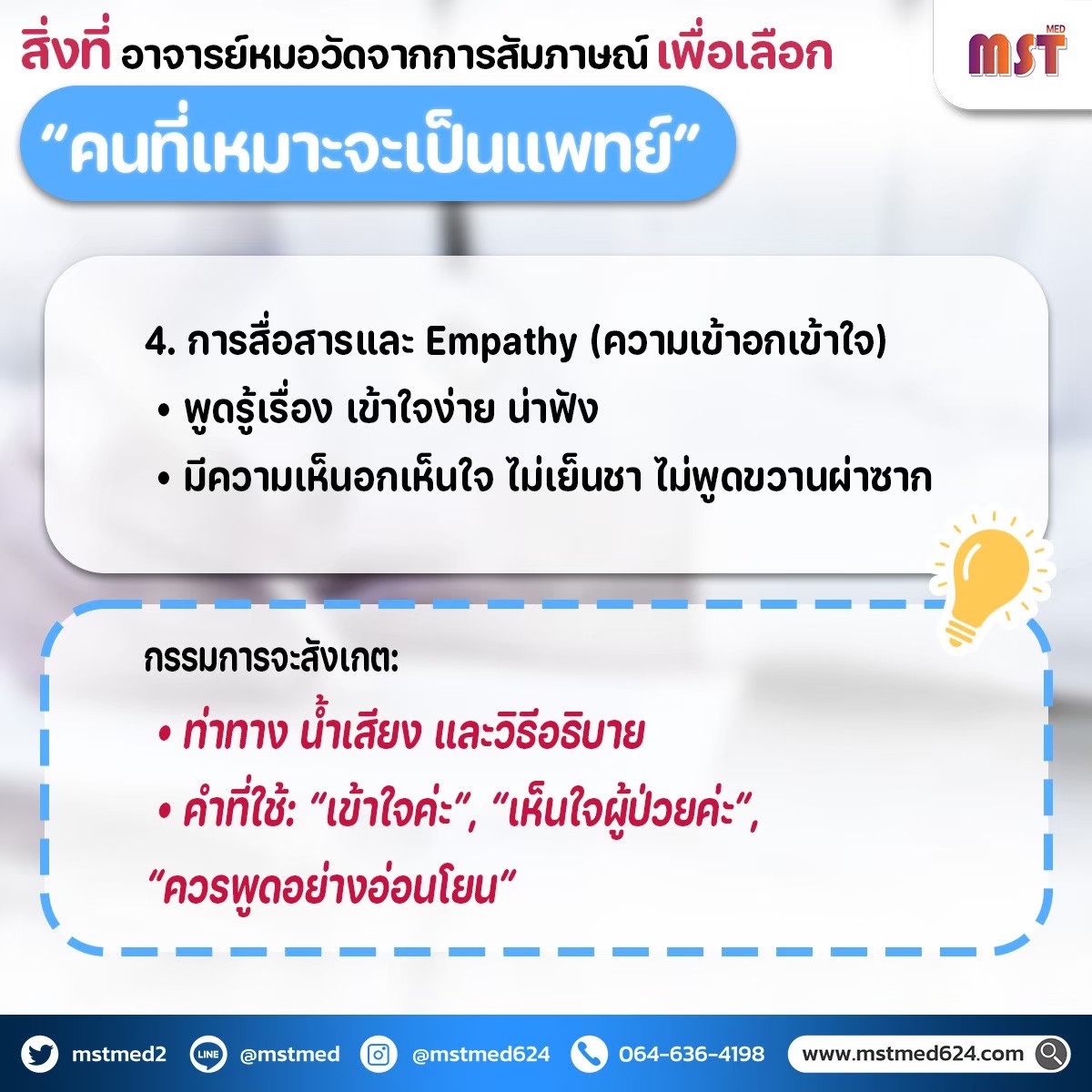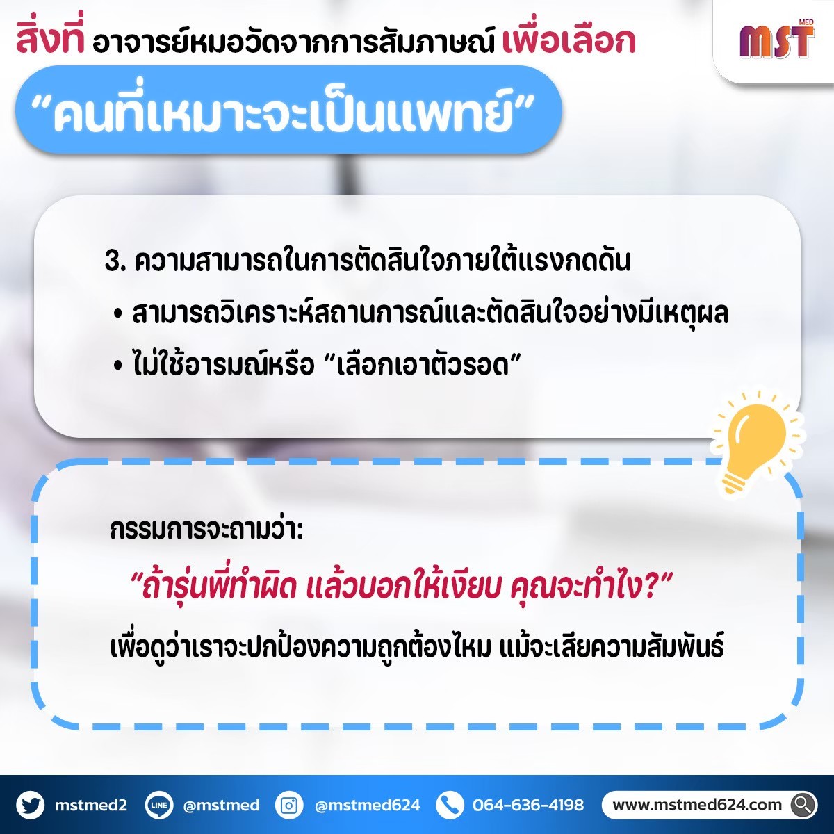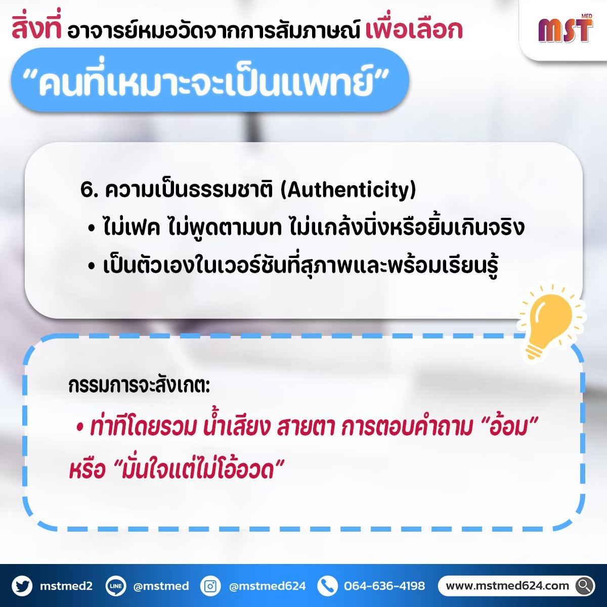 💡 เจตคติ (Attitude) ต่อวิชาชีพแพทย์: กรรมการจะเจาะลึกว่าคุณอยากเป็นหมอเพราะ "แพสชั่น" จริง ๆ หรือไม่? เข้าใจความเหนื่อยล้า ความกดดัน และความรับผิดชอบต่อชีวิตผู้อื่นหรือไม่? (ดูจากคำถาม เช่น "พร้อมเสียสละไหม?")