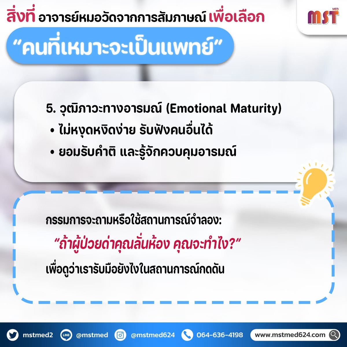 🧘♀️ วุฒิภาวะทางอารมณ์ (Emotional Maturity): การควบคุมอารมณ์ในสถานการณ์กดดัน การยอมรับคำตำหนิ และการรับฟังผู้อื่น (โจทย์จำลอง: "ถ้าผู้ป่วยด่าคุณลั่นห้อง คุณทำไง?")