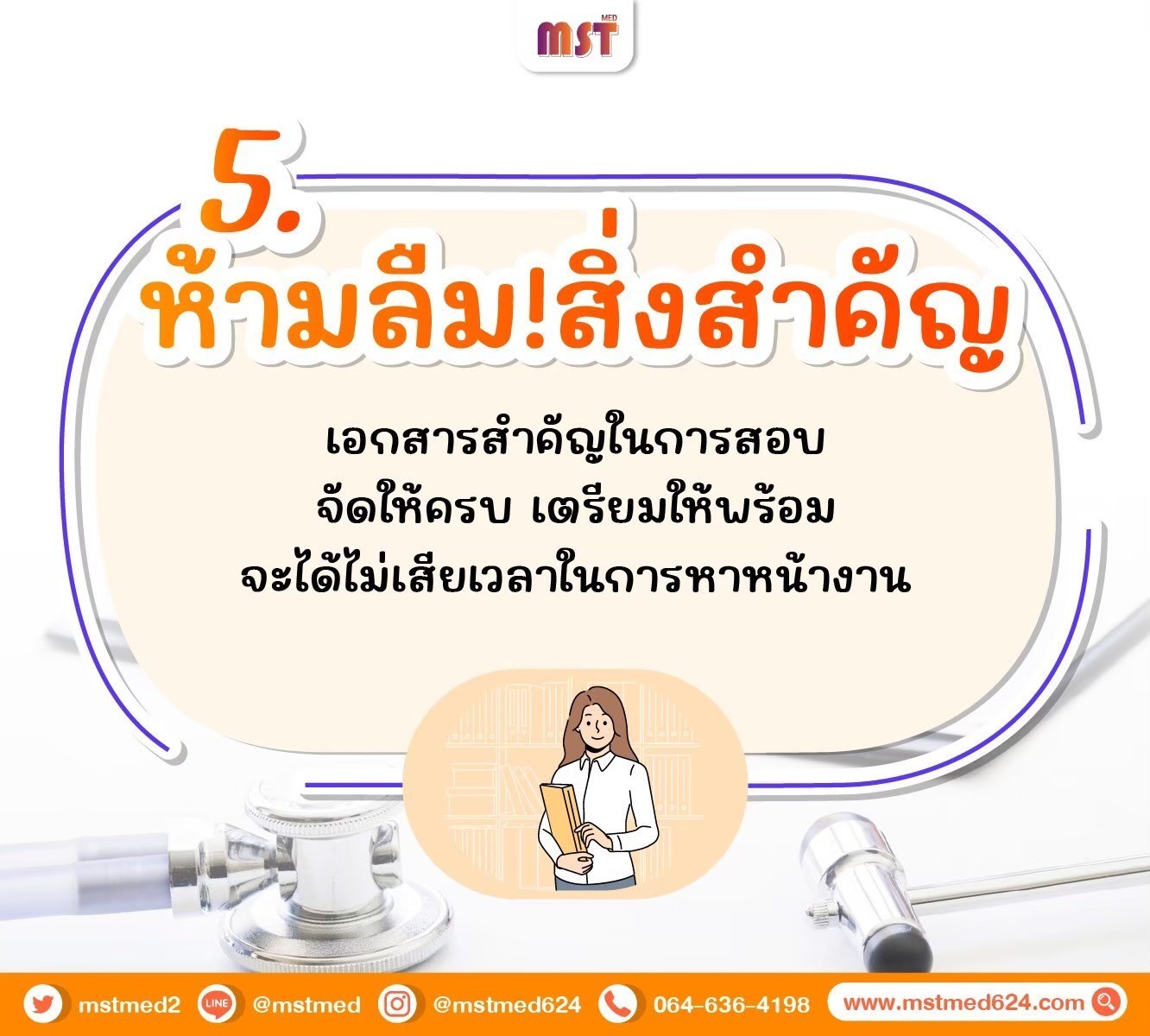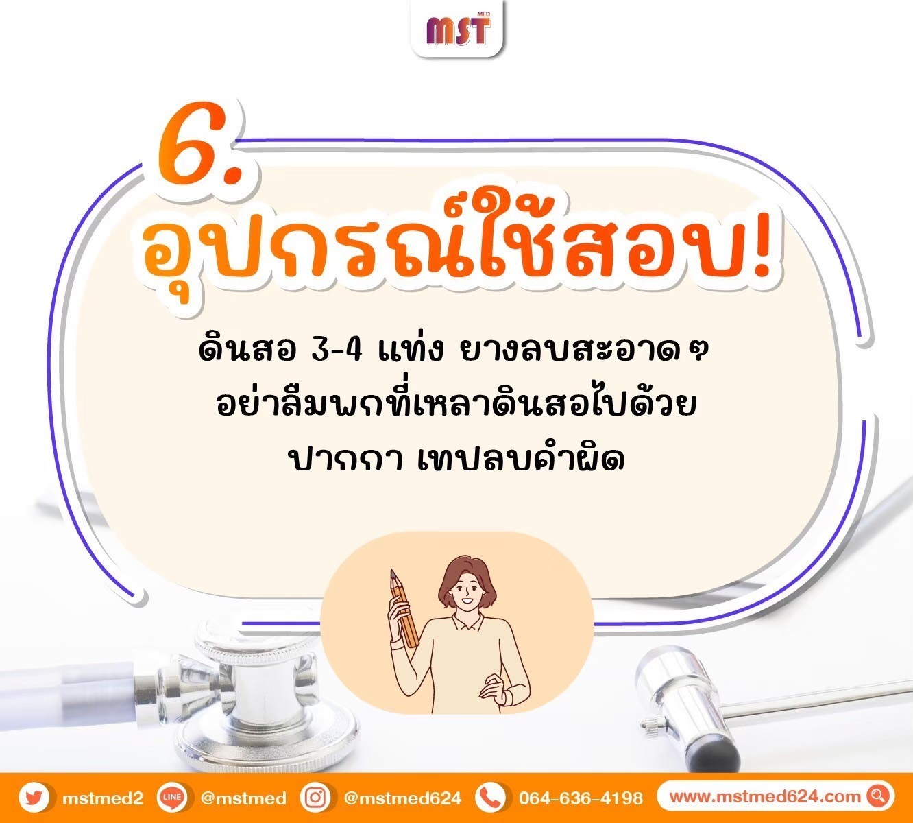 ใครที่กำลังตื่นเต้นจนทำตัวไม่ถูก หรือกังวลจนนอนไม่หลับ วันนี้พี่ๆ 𝐌𝐒𝐓 𝐌𝐄𝐃 มี 𝟔 เคล็ดลับ "เตรียมตัวก่อนสอบ" มาฝากกันแบบเน้นๆ เพื่อความเป๊ะปังในวันจริง!