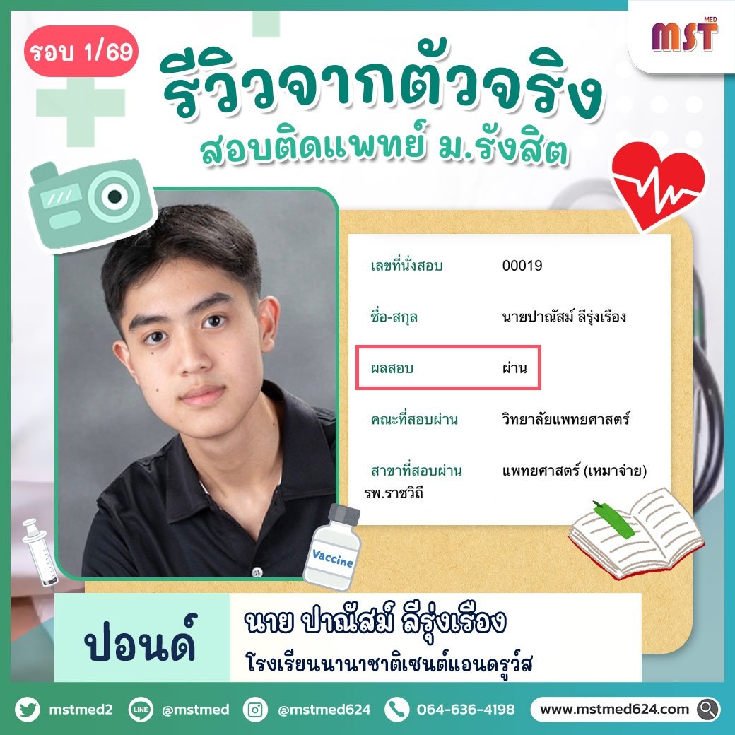 ปังไม่ไหว! รีวิวจากตัวจริง น้องปอนด์คนเก่ง สอบติด "แพทย์ ม.รังสิต" ได้สำเร็จแล้ว!