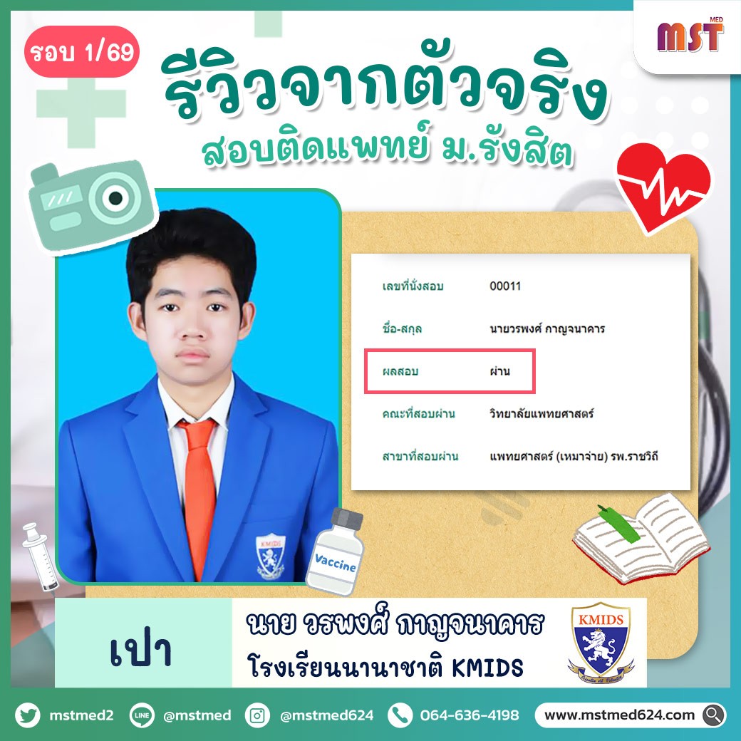 ขอแสดงความยินดีกับ "น้องเปา" นายวรพงศ์ กาญจนาคาร นักเรียนคนเก่งจากโรงเรียนนานาชาติที่ สอบติดคณะแพทยศาสตร์ ม.รังสิต ได้สำเร็จ เก่งมากๆ เลยค่ะ!