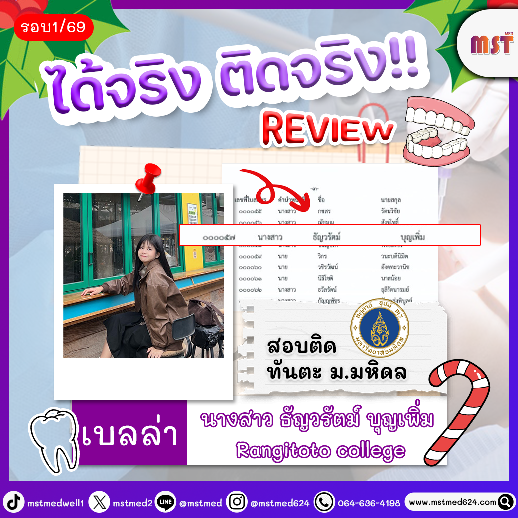 ขอปรบมือดังๆ ให้กับ "น้องเบลล่า" (นางสาว ธัญวรัตน์ บุญเพิ่ม) จาก Rangitoto College ที่มุ่งมั่นตั้งใจจนสอบติด คณะทันตแพทยศาสตร์ มหาวิทยาลัยมหิดล รอบ 1/69 ได้สำเร็จ!
