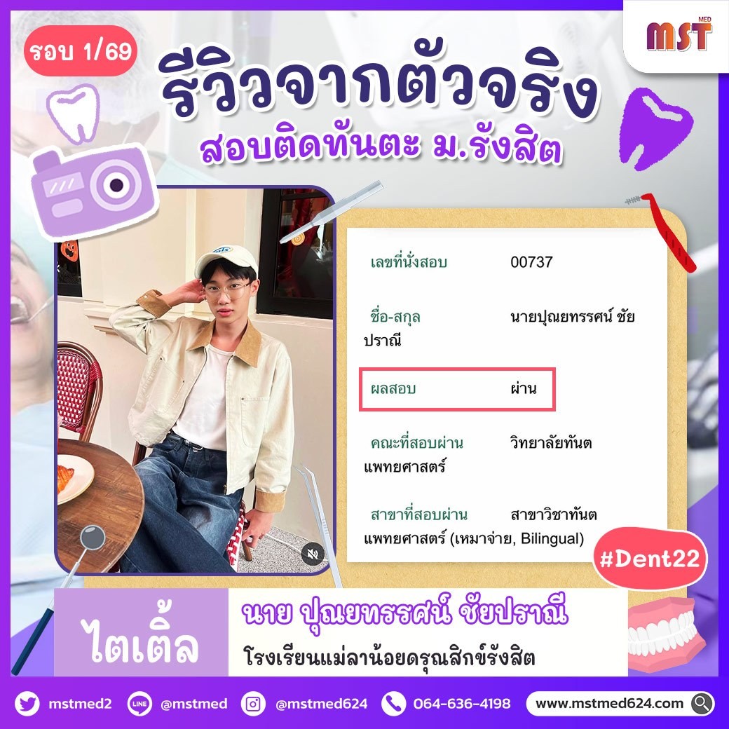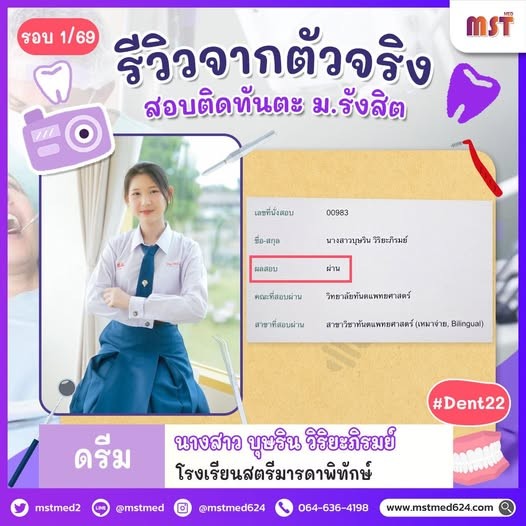 ขอแสดงความยินดีกับ "นางสาวบุษริน วิริยะภิรมย์" (น้องดรีม) จากโรงเรียนสตรีมารดาพิทักษ์ ที่สอบ "ผ่าน" เข้าเรียน สาขาวิชาทันตแพทยศาสตร์ วิทยาลัยทันตแพทยศาสตร์ ม.รังสิต ได้สำเร็จค่ะ!