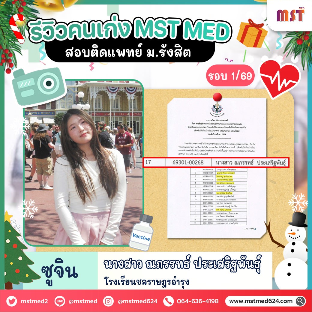 ขอแสดงความยินดีอย่างเป็นทางการกับ "น้องซูจิน" นางสาว ณภรรทธ์ ประเสริฐพันธุ์ จากโรงเรียนชลราษฎรอำรุง ที่สอบติด คณะแพทยศาสตร์ มหาวิทยาลัยรังสิต